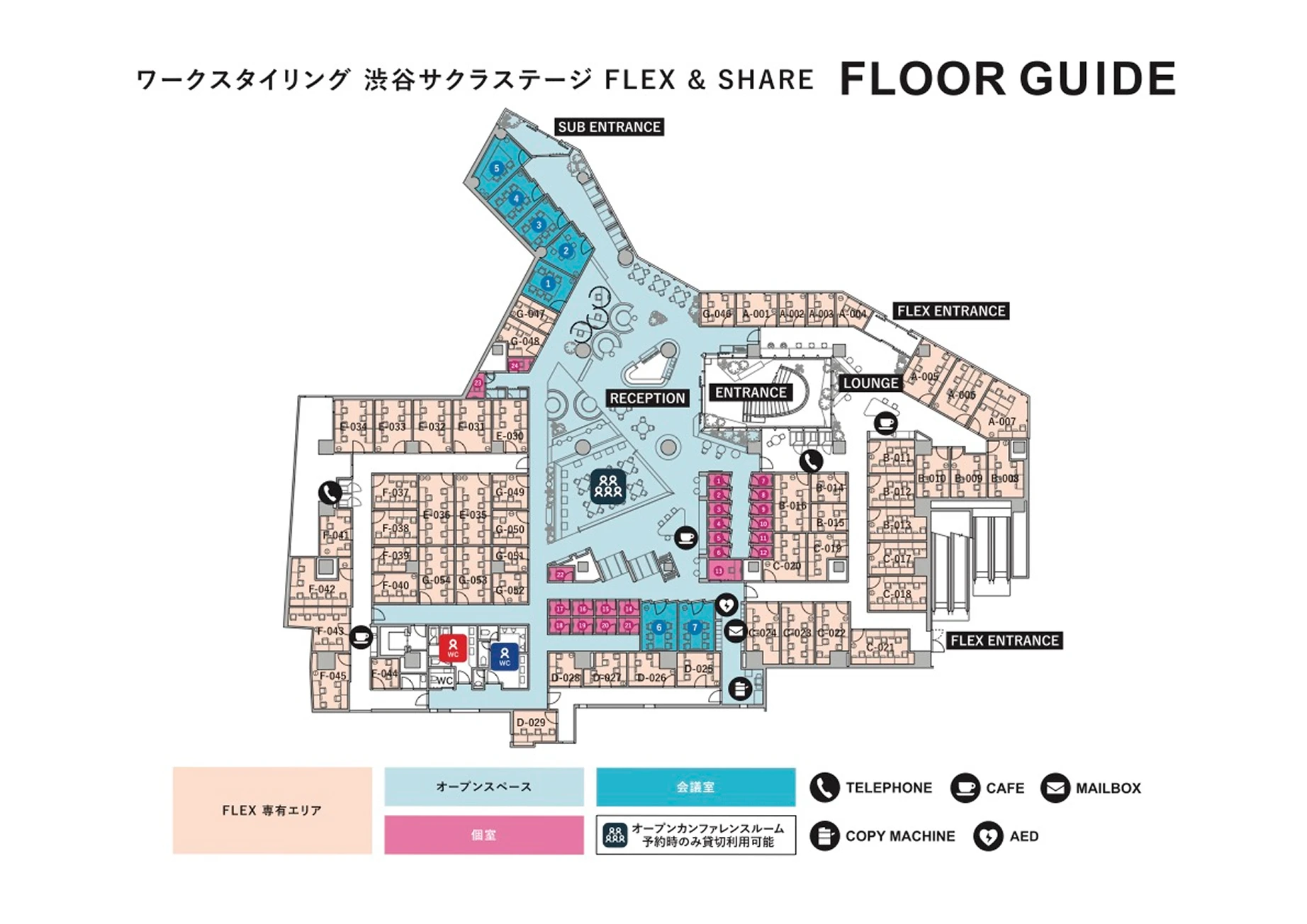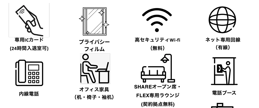 - ANSWER :従量課金プラン(SHARE)のオープンスペース・会議室のみご利用いただけます。